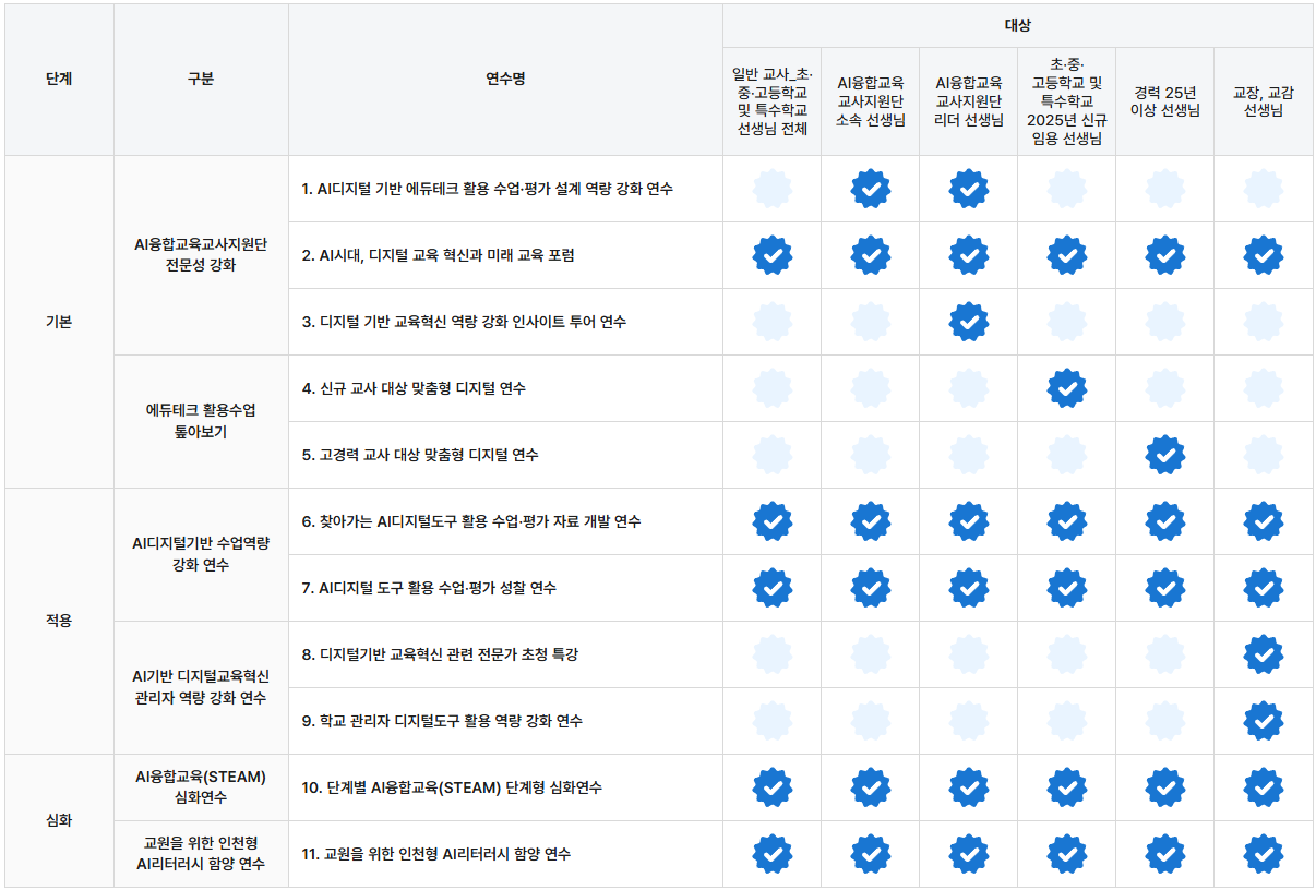 공지사항연수 신청 방법1 - 연수에 맞는 대상자 확인하기 조회 수: 945 등록일: 2025-09-17 14:37:34 다음글 목록 선생님! 연수를 듣기 전에 먼저 ‘대상자’를 확인해주세요!! 선생님은 어디에 속하시나요?